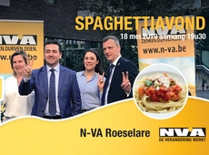 Spaghettiavond Zaterdag 18 mei om 19u30 Lokatie: De Nieuwe Deure, Izegemseaardeweg 30, Roeselare - Beveren Aperitief en Spaghetti 15 euro Betaling geldt als inschrijving BE71 8538 1428 9669 BIC SPAABEBB Ter ondersteuning van de Vlaamse, Federale en Europese verkiezingen nodigt N-VA Roeselare u uit …
